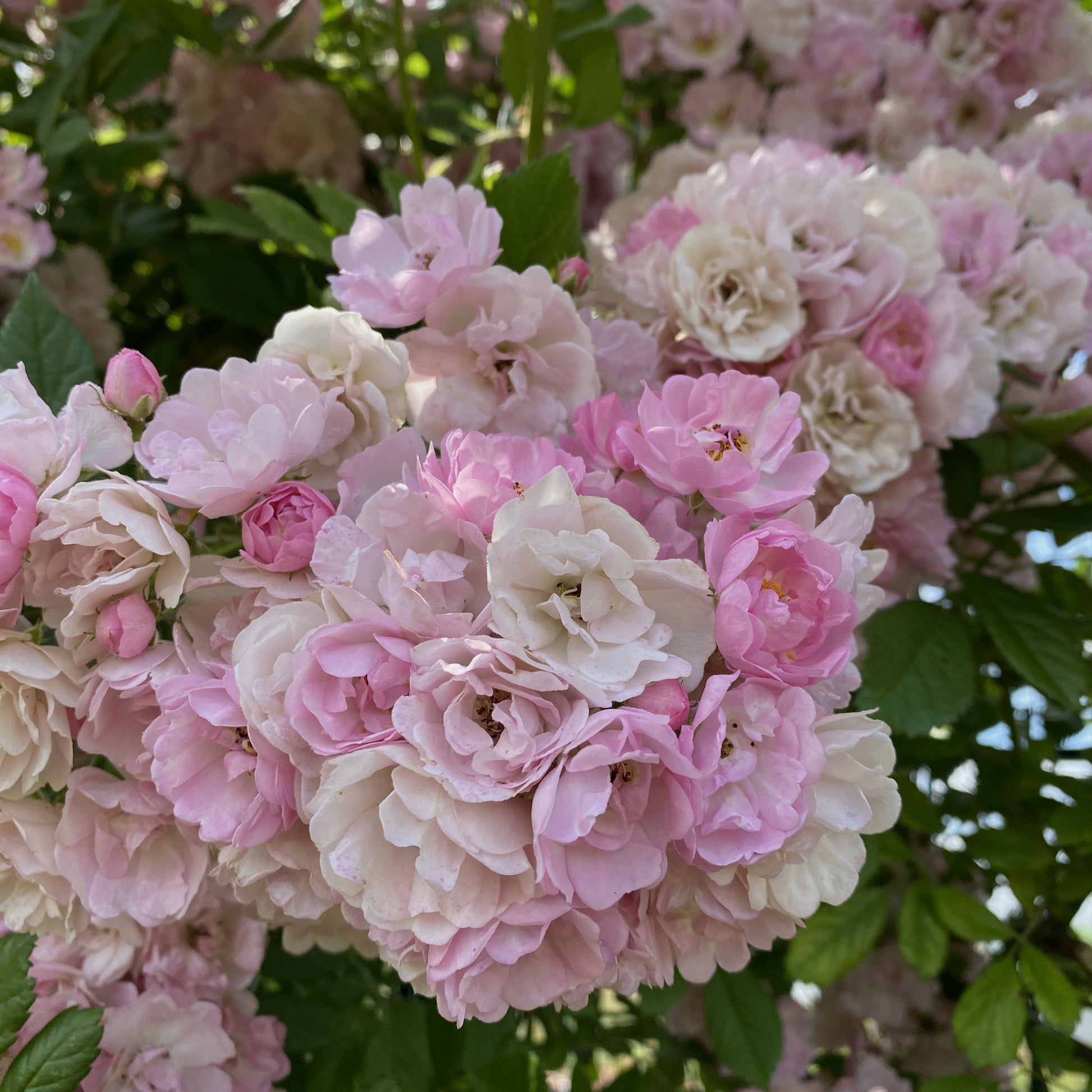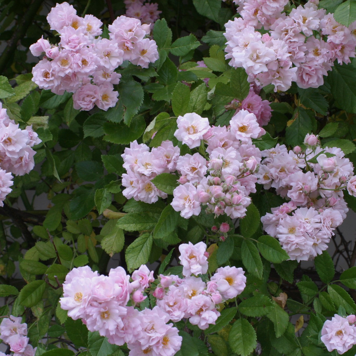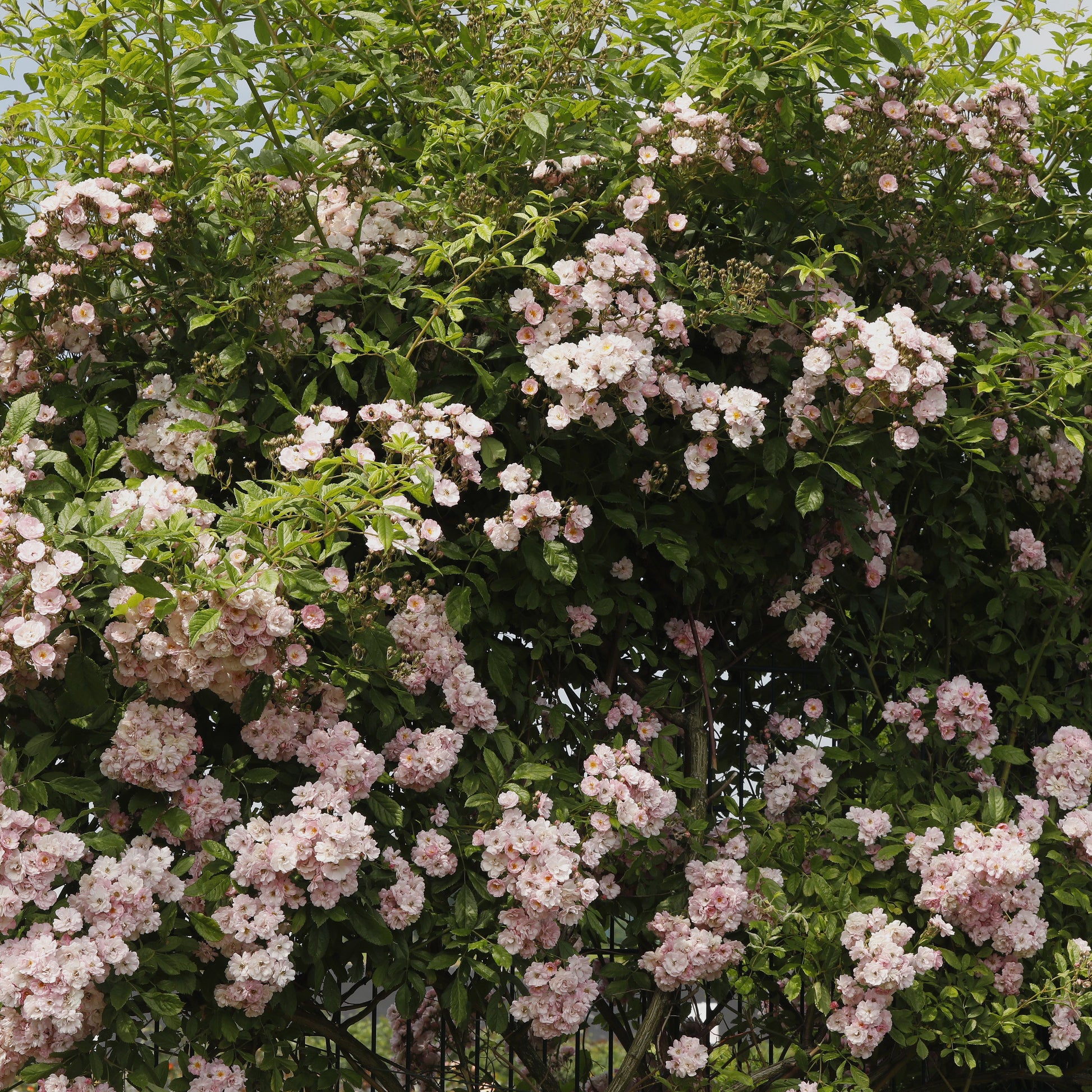A vigorous climbing rose, it is ideal for covering overhead walkways or walls and fences. The flowers are produced in large clusters, with a light sweet perfume and are delicate pink blush in colour. It has pleasant light green foliage, but it's important to point out that it does not repeat flower, giving one big show from early June for about four to five weeks depending on the weather.